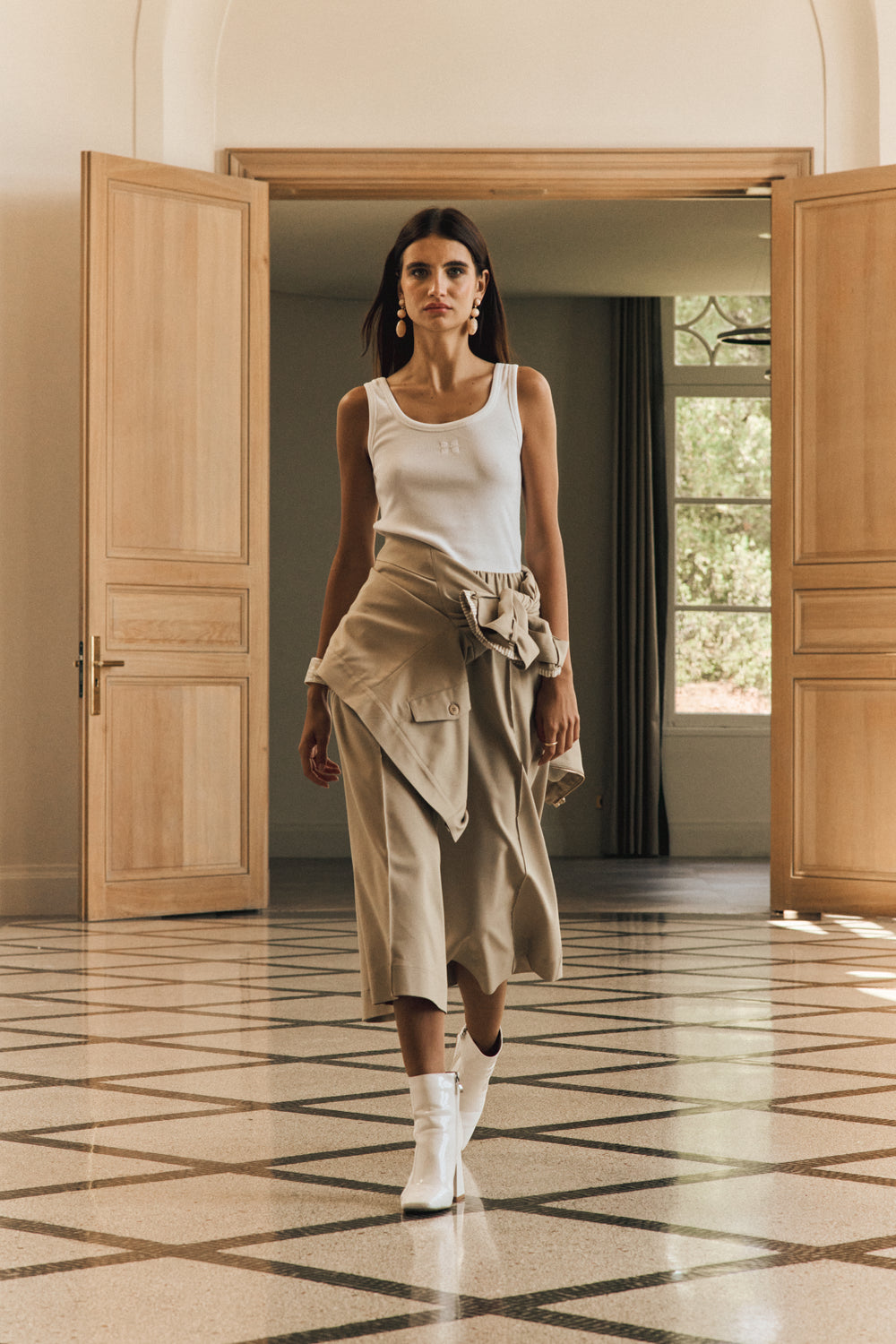 Le second thème s'inspire d'une floraison raffinée. Les teintes s'adoucissent, les lignes se font légères. Entre fleurs délicates et jeux de rayures subtils, la silhouette s'enveloppe d'un souffle raffiné printanier.