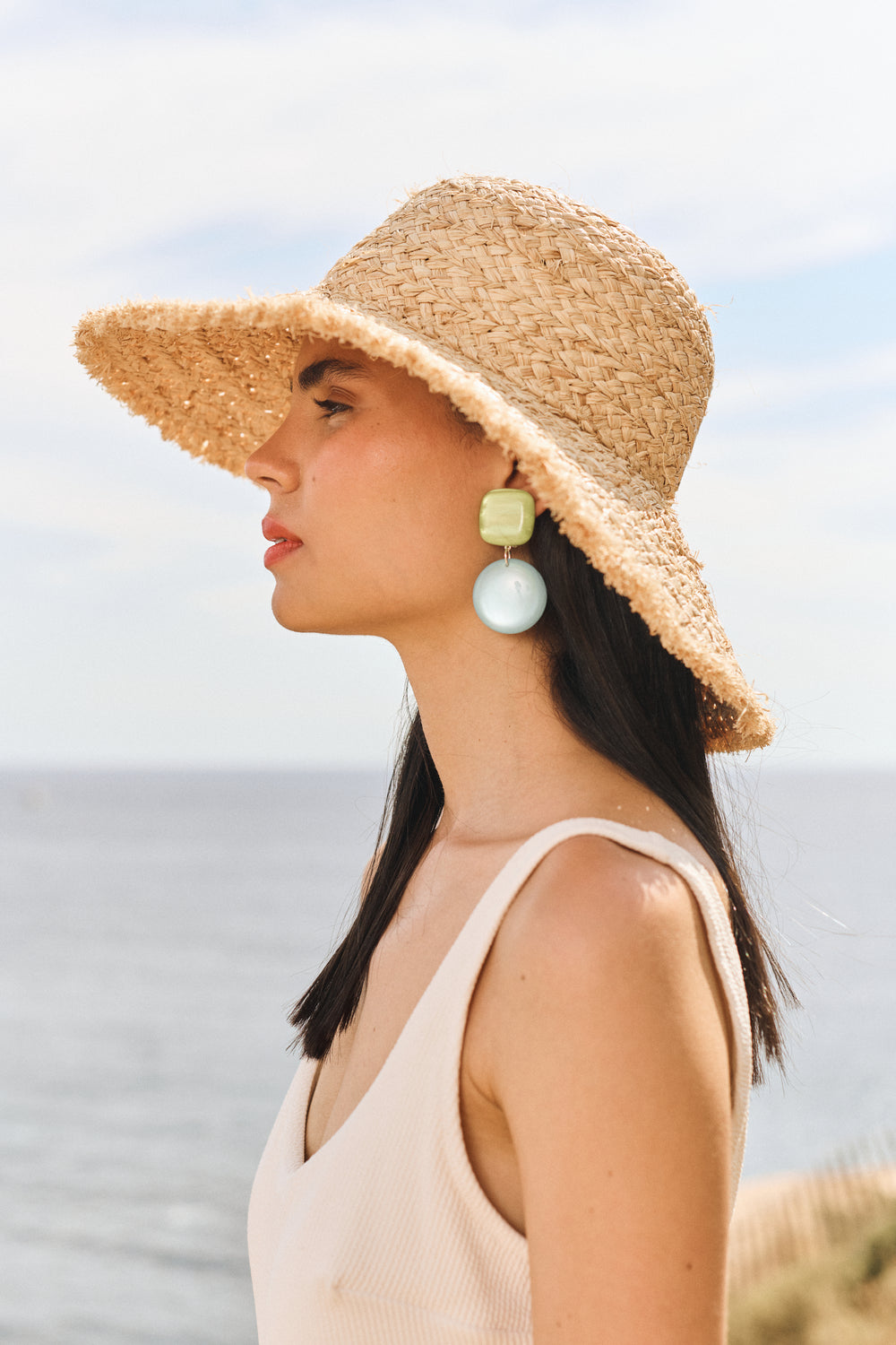 Les boucles d’oreilles ATLAS associent un cabochon vert givré à un disque bleu givré pour une silhouette graphique et lumineuse. Leur attache clip en laiton rhodié assure confort et élégance au quotidien.