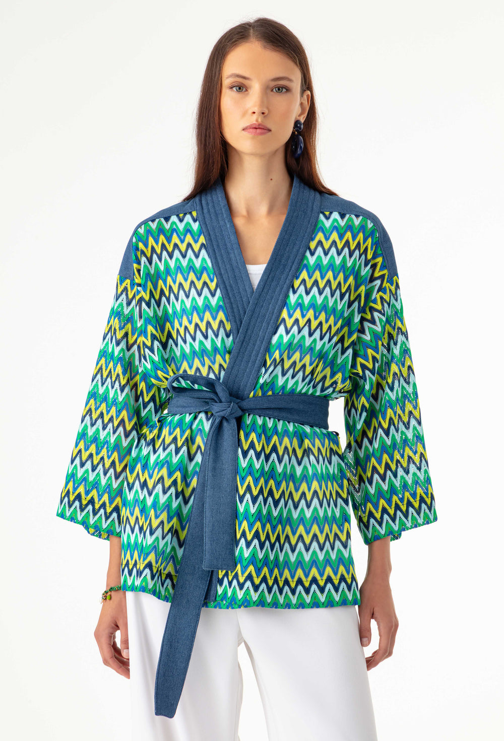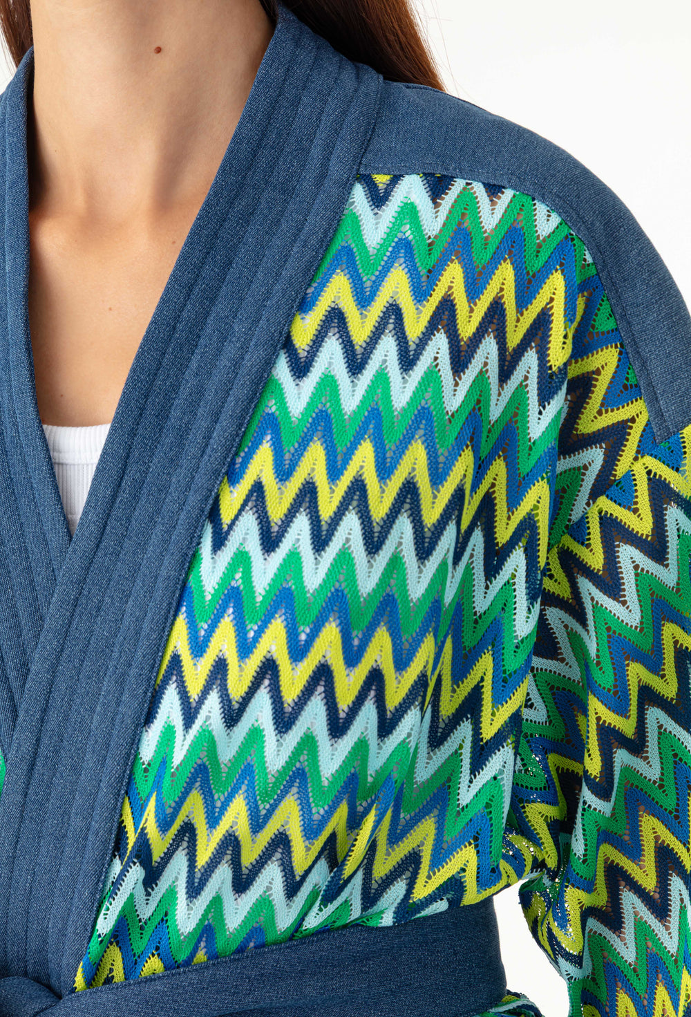The Joyce kimono plays on the contrast between chevron knit and denim-effect fleece for a fluid, structured and contemporary silhouette.