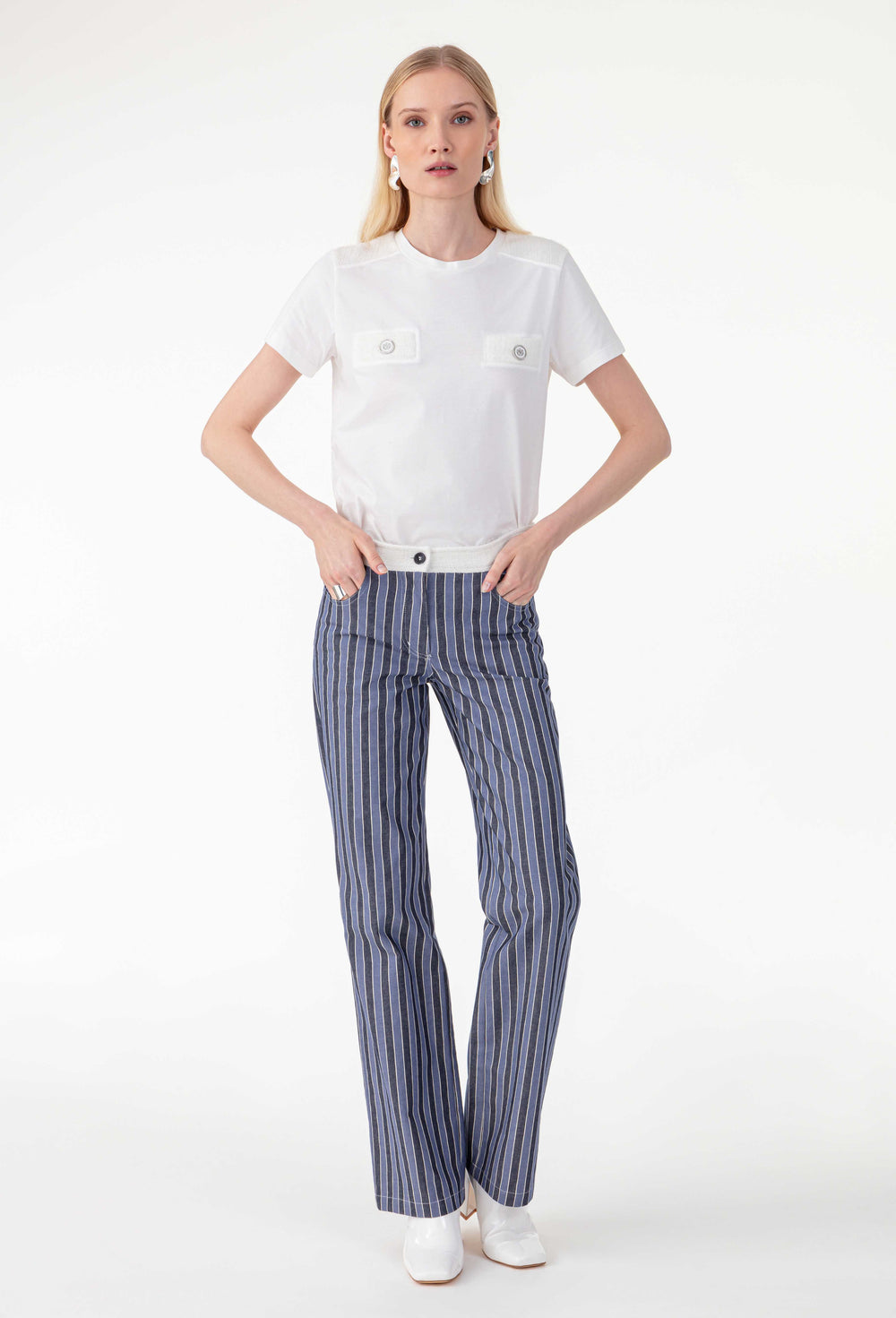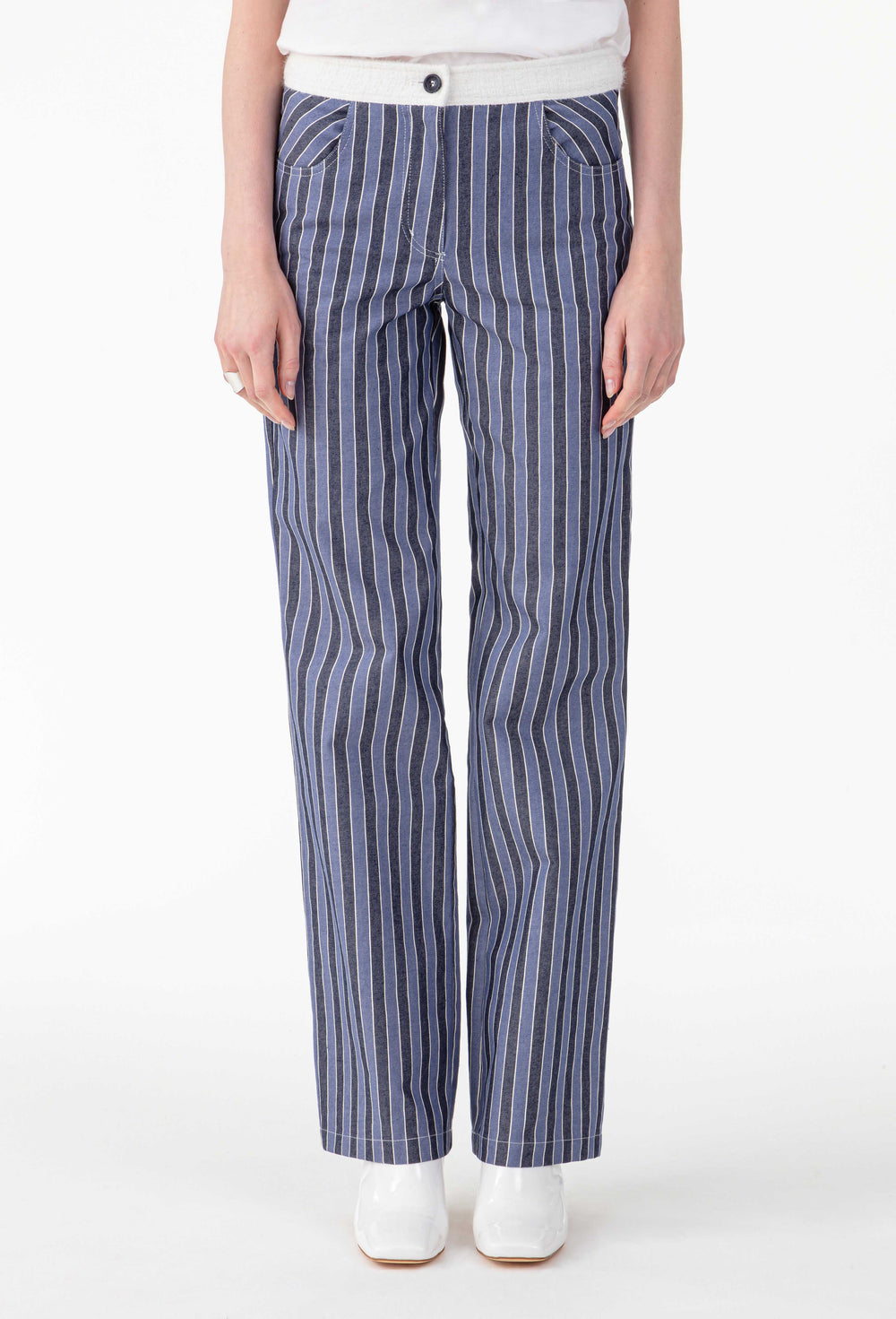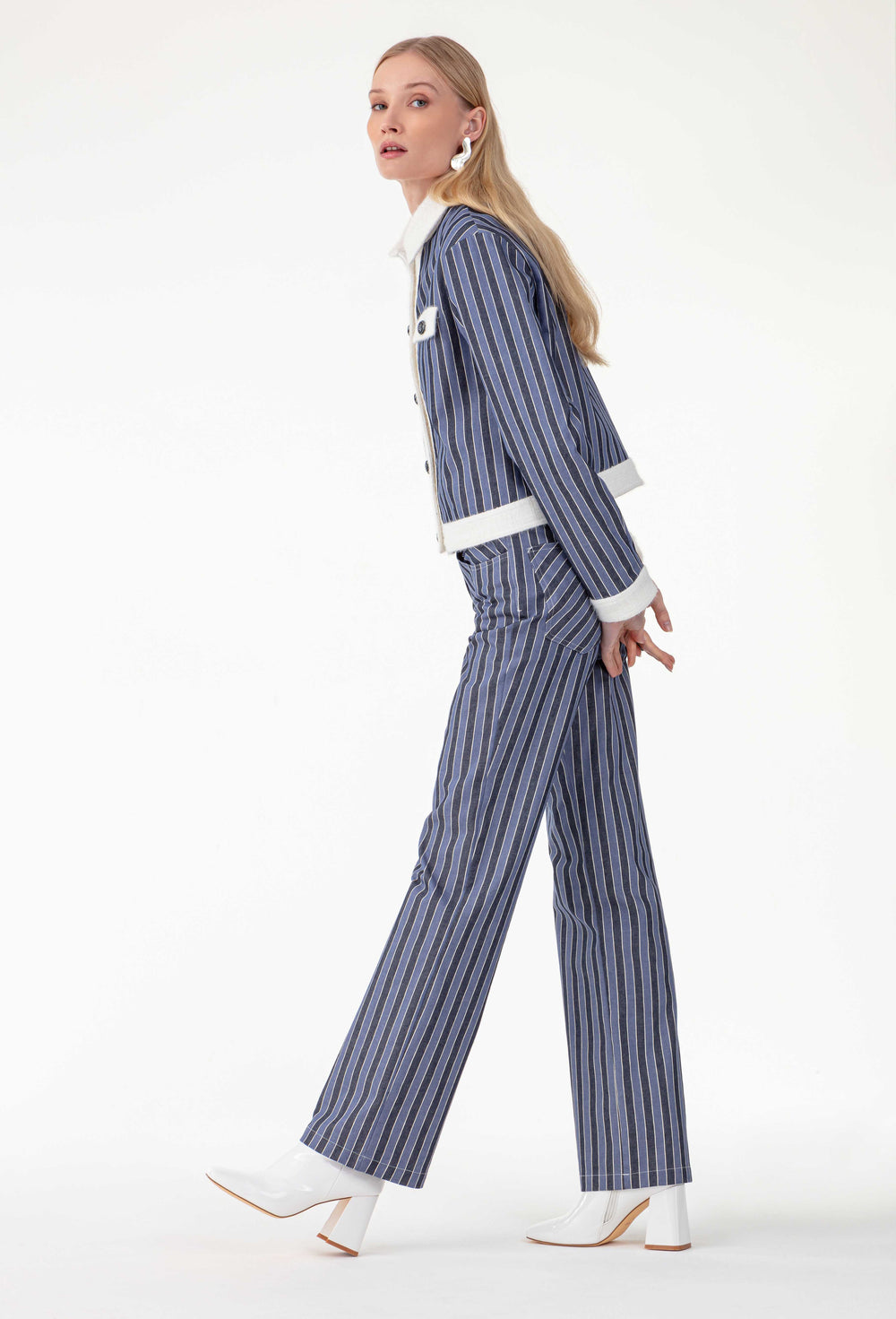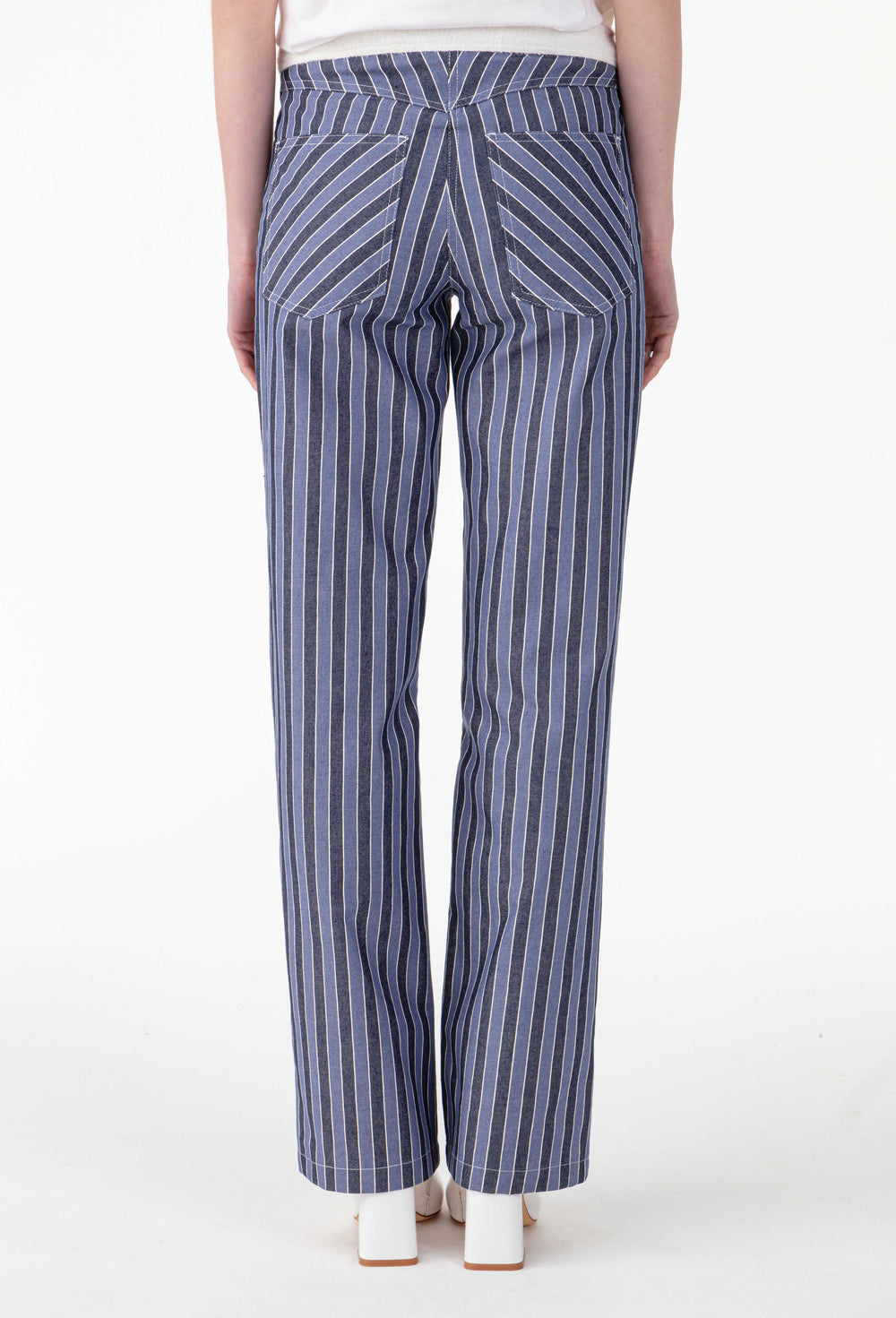 The ADRIAN jeans are one of the collection's signature pieces with their regular fit, striped denim and contrasting tweed belt.