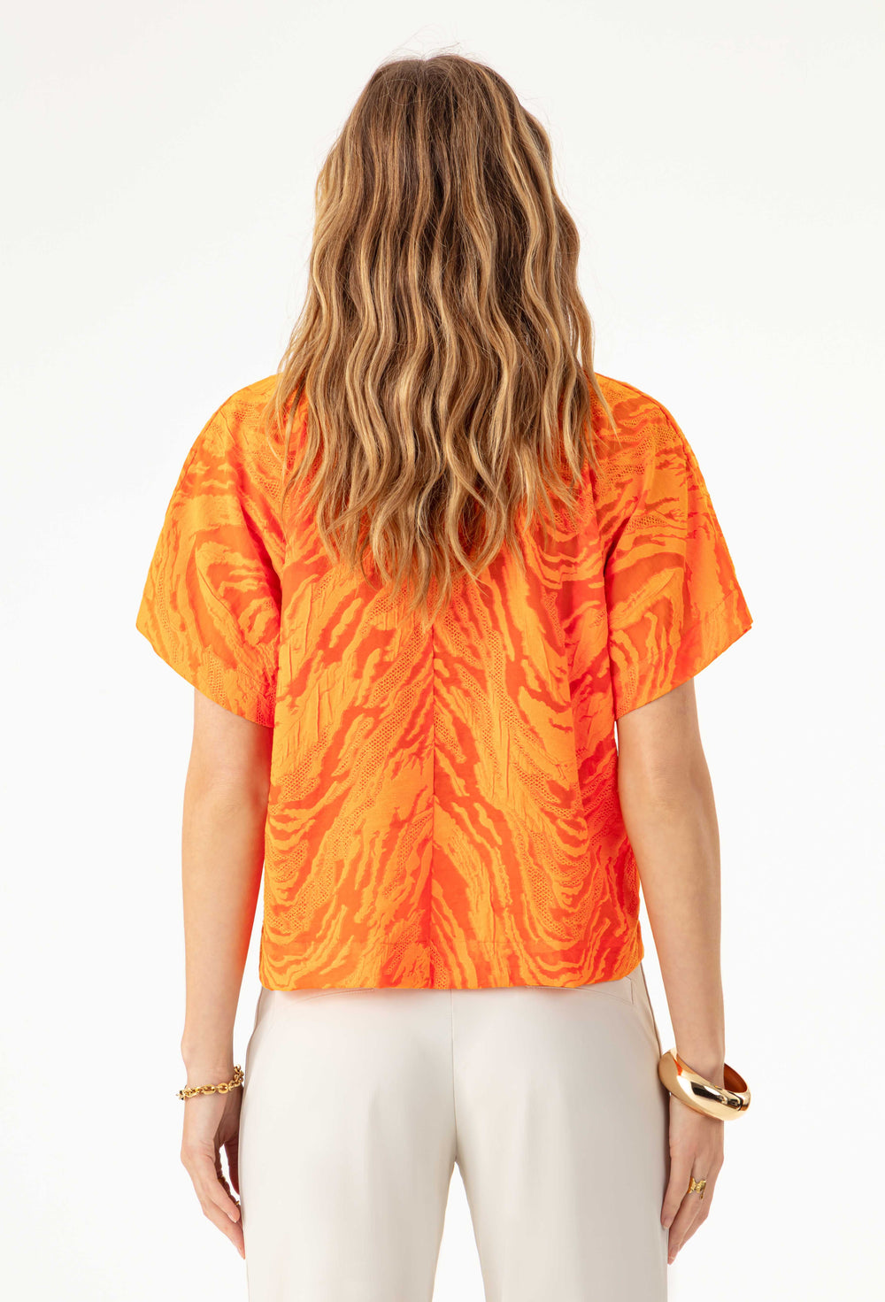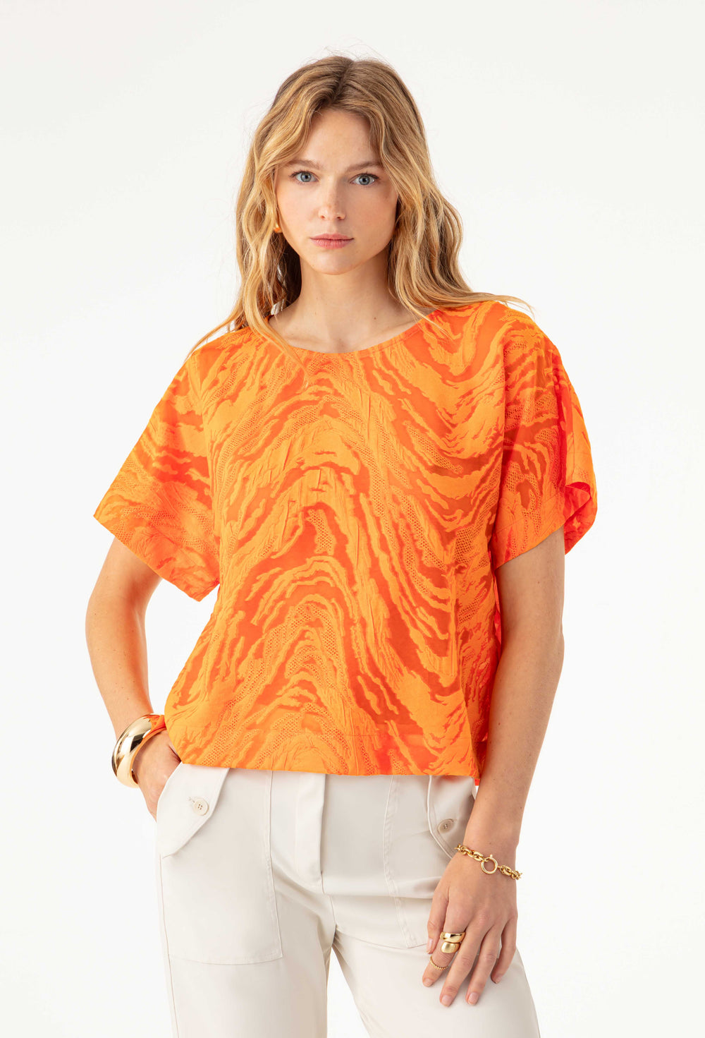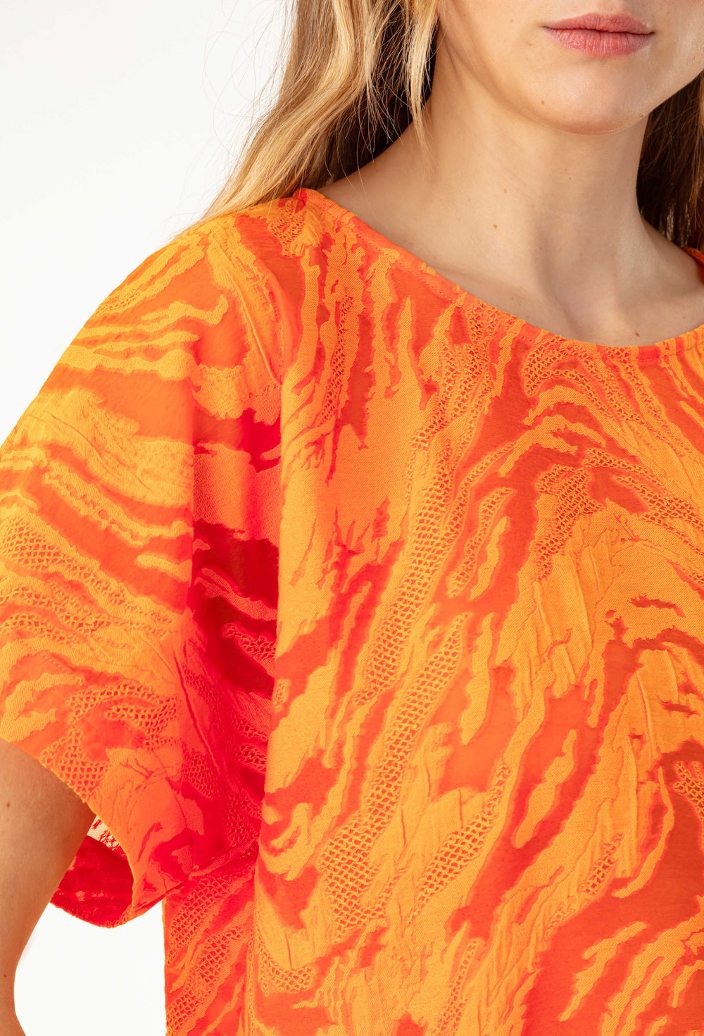The Roslyn top is captivating thanks to its orange burnout fabric and contemporary boxy cut. Its round neck and French armholes create a structured and luminous silhouette.