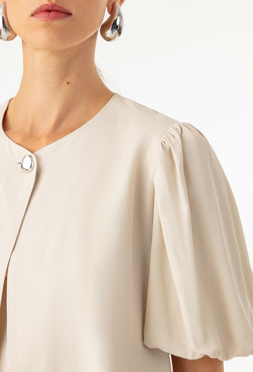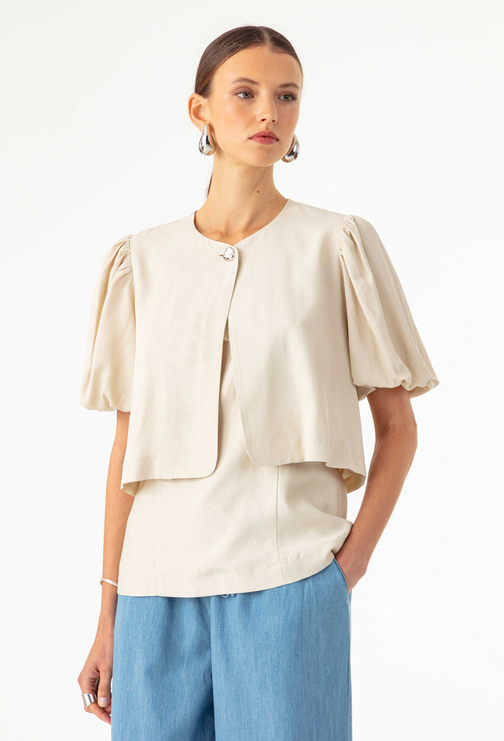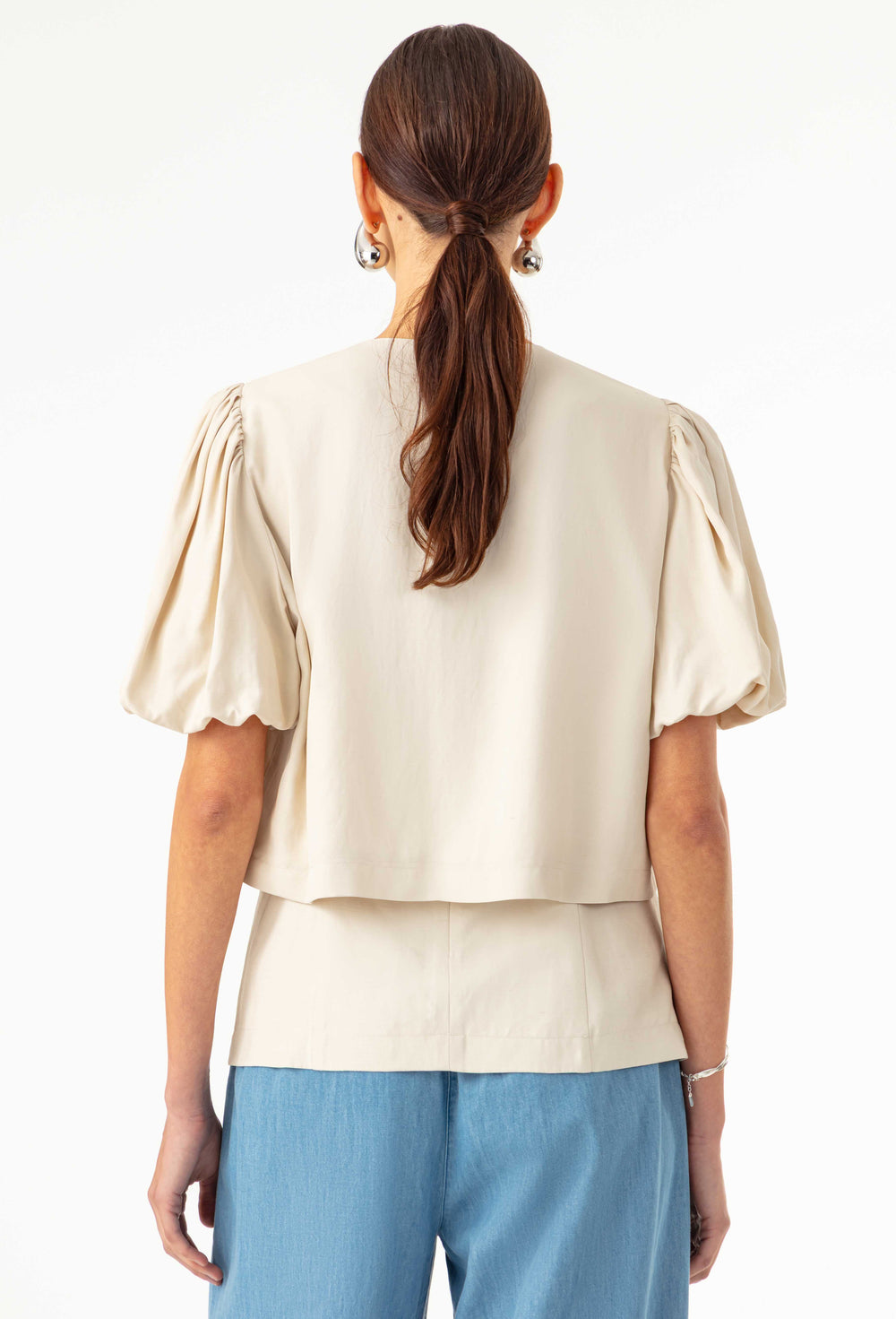La mannequin mesure 1,71m et porte une taille 36.