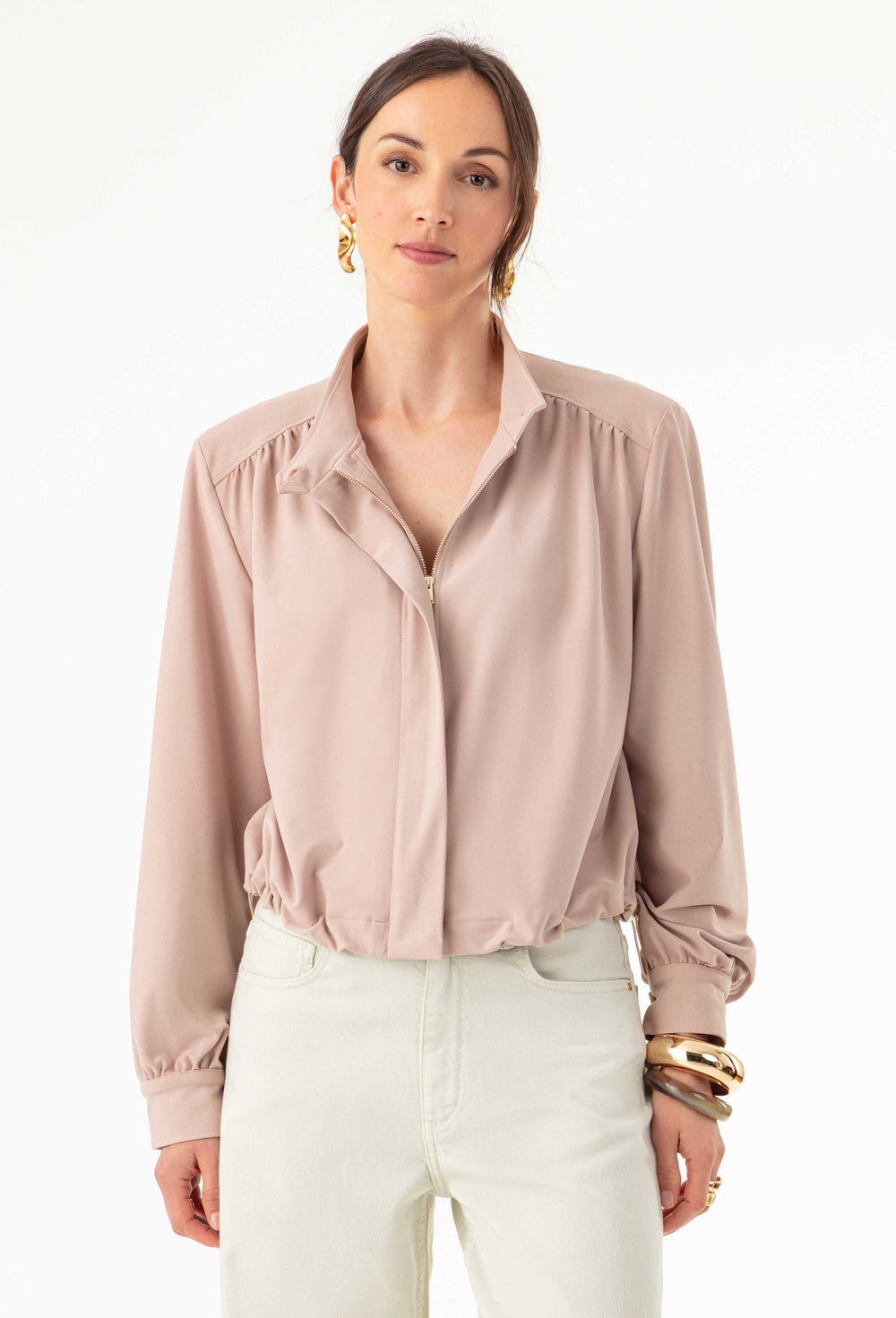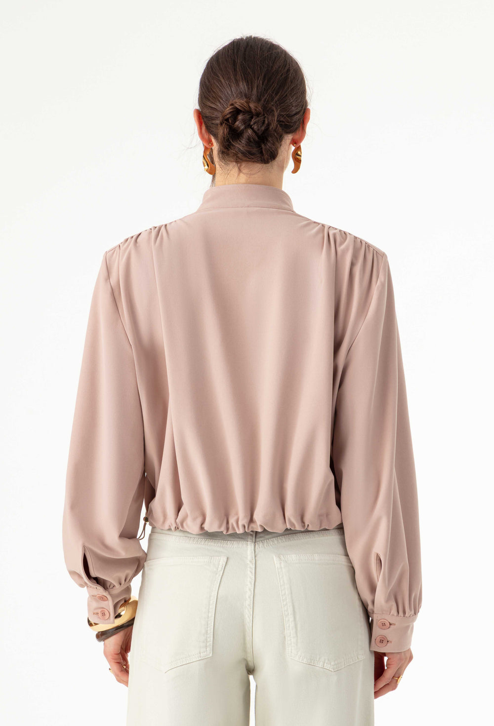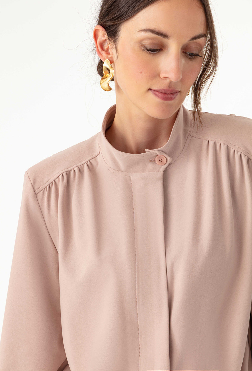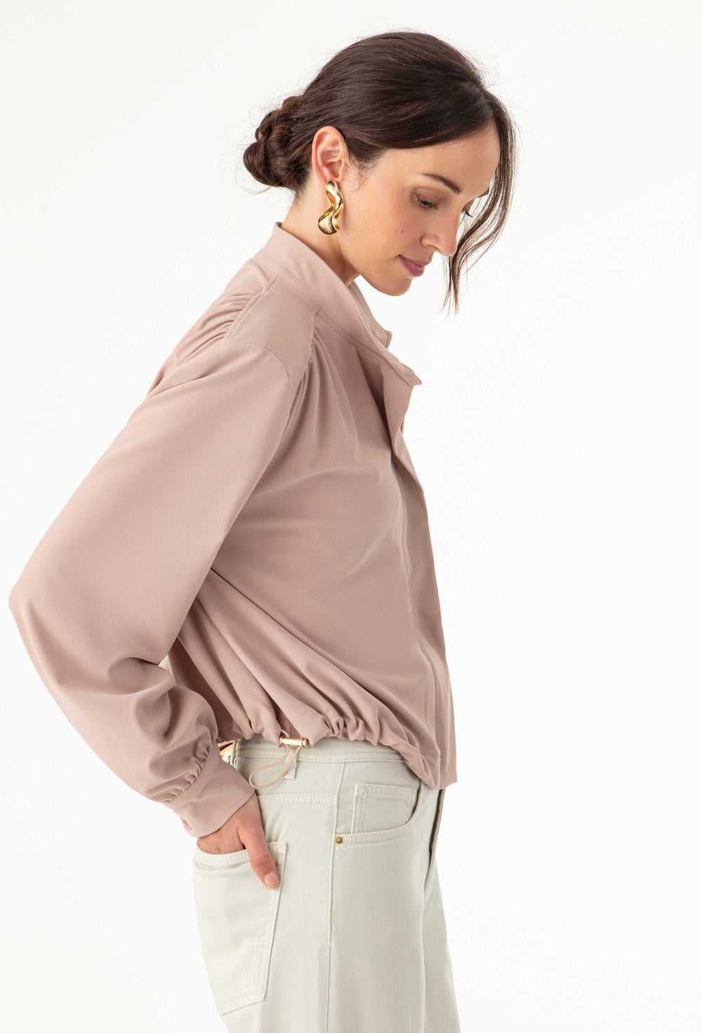 La mannequin mesure 1,73m et porte une taille 36.
