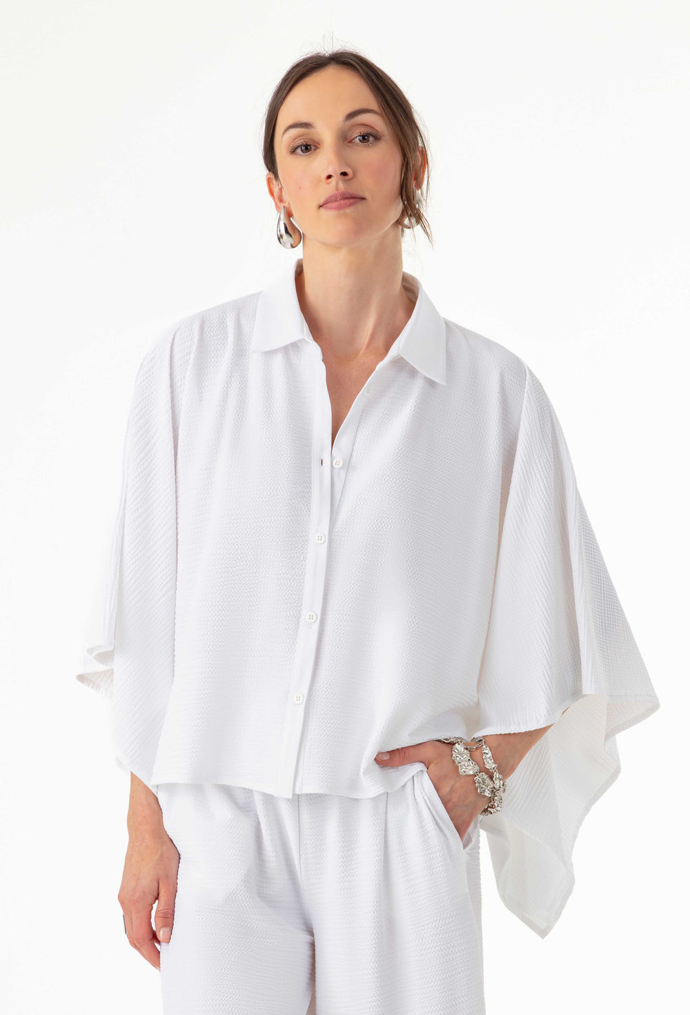 La chemise Mona joue les volumes avec sa coupe boxy oversize et son jersey technique effet gaze de coton, pour une allure moderne et décontractée.