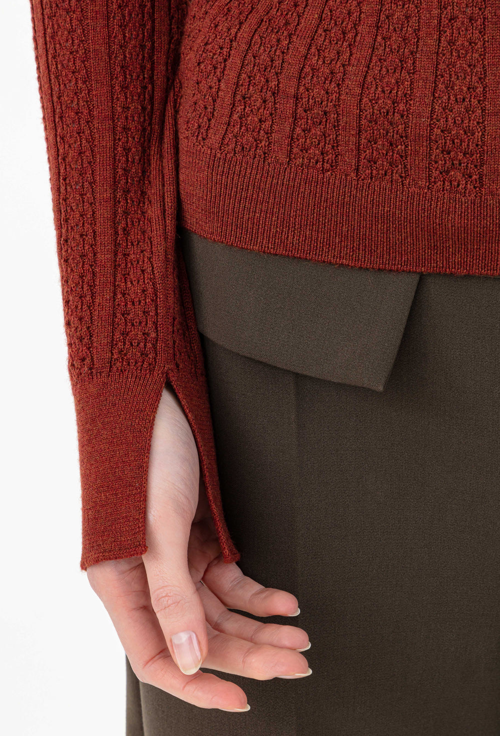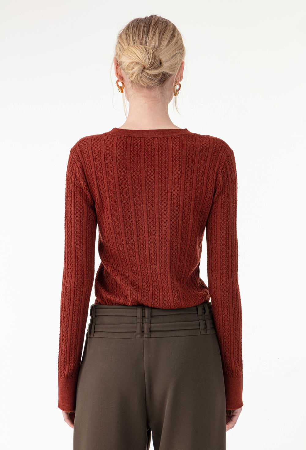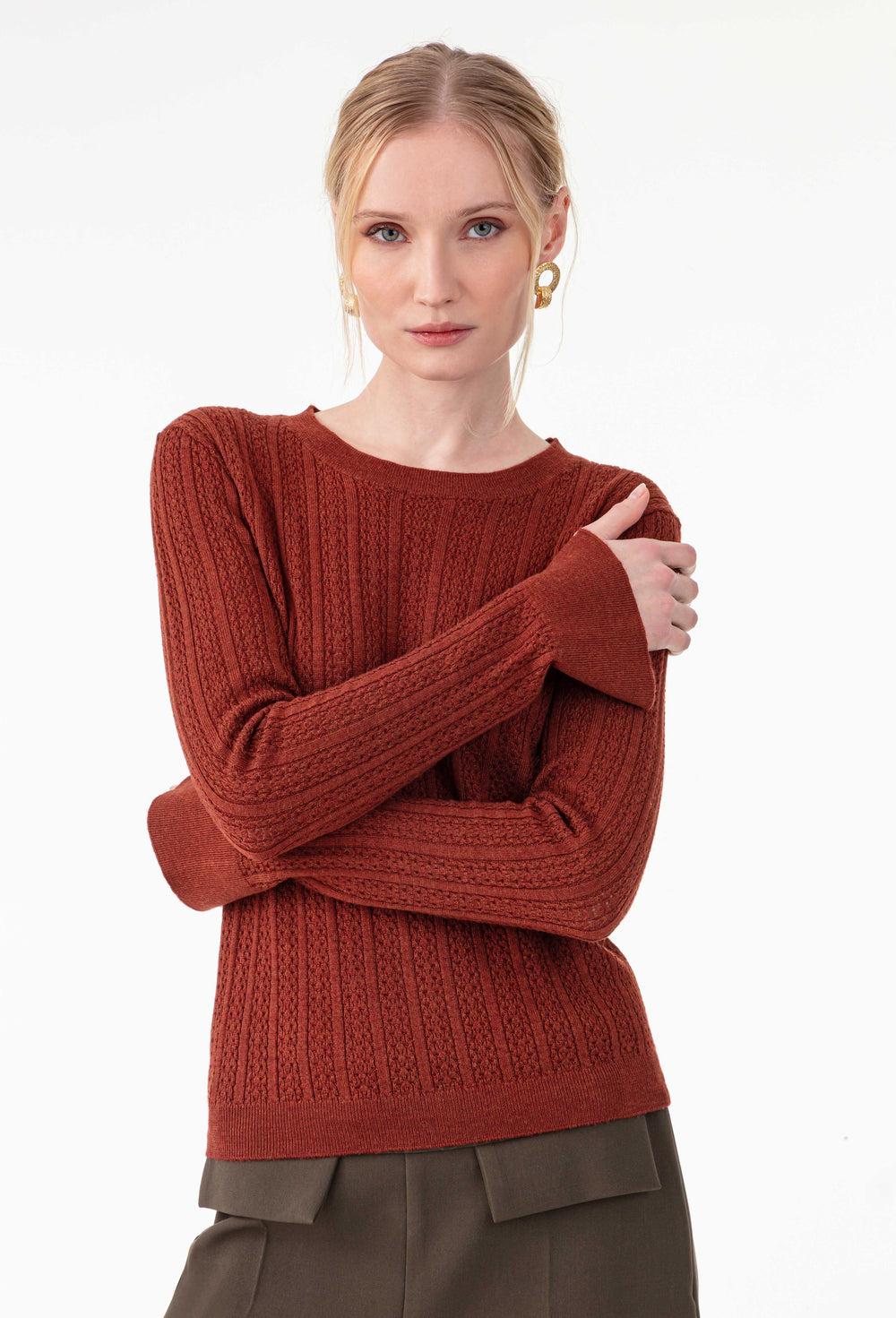 Le pull Thalia séduit par son tricot en laine ajourée et ses finitions soignées. Une pièce féminine, délicate et confortable.