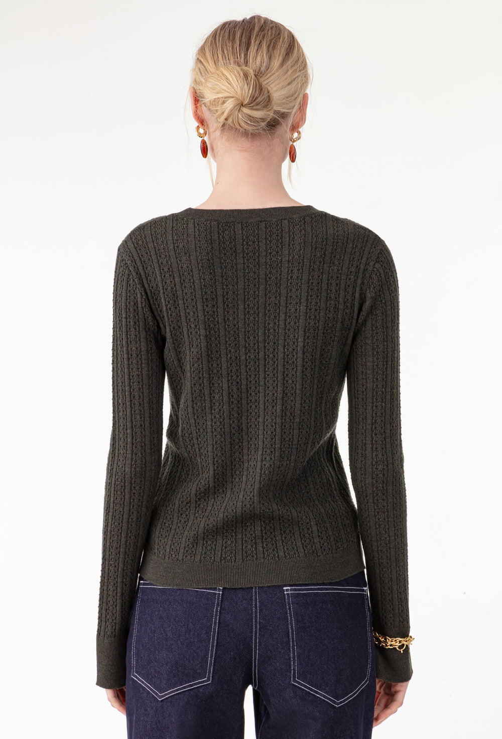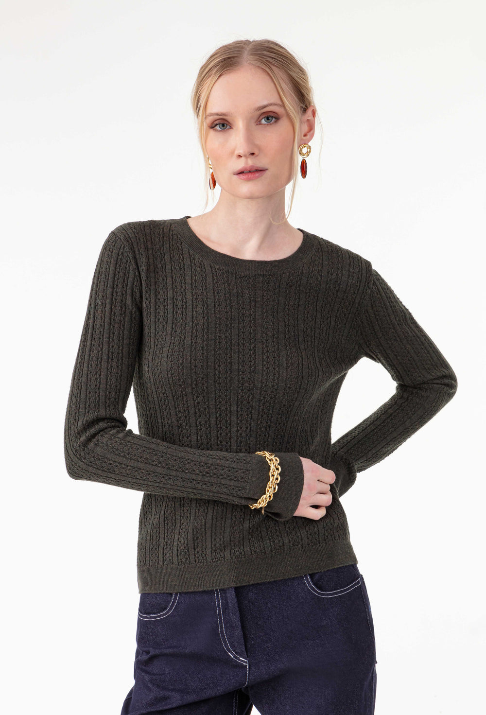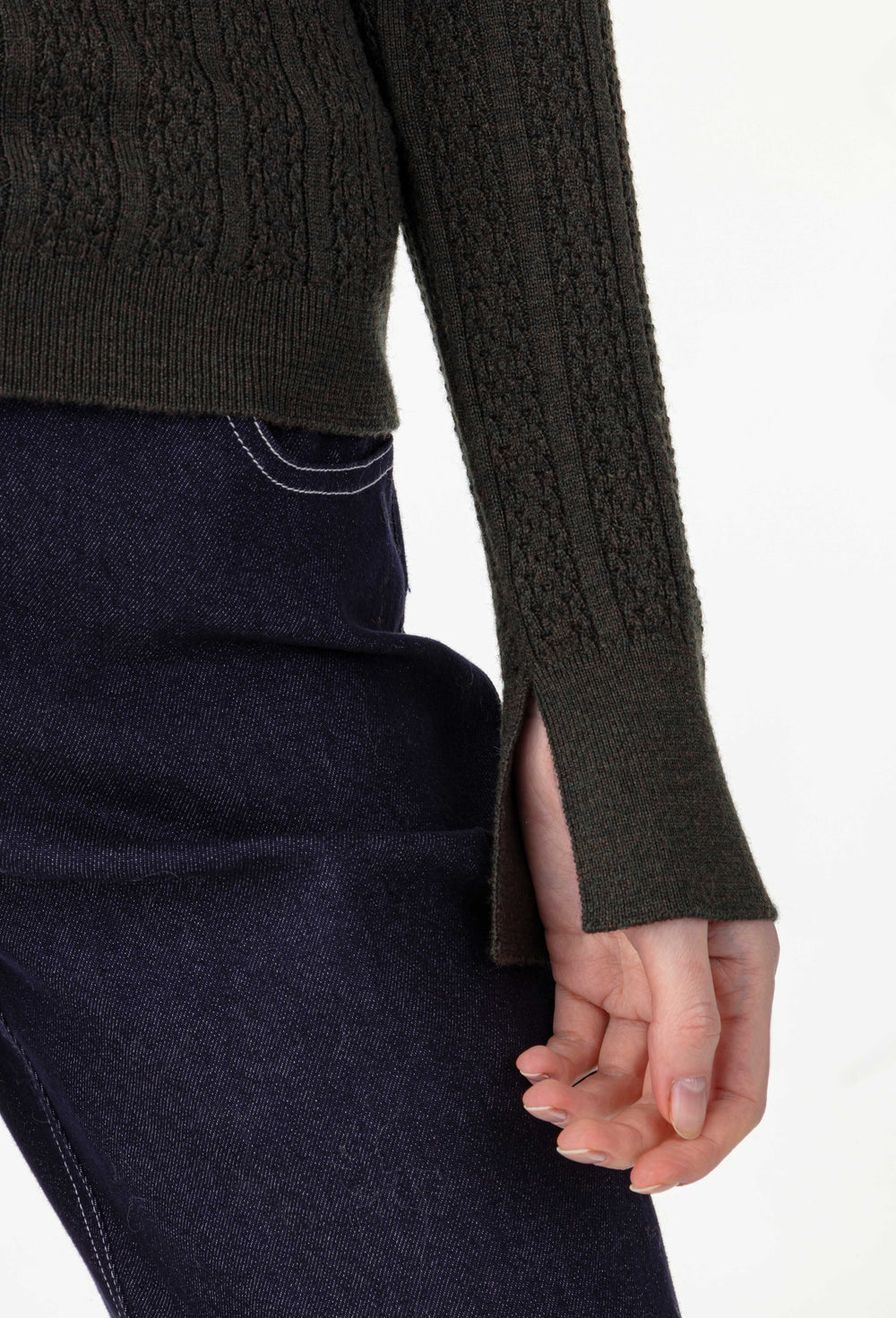 Le pull Thalia en laine se décline en vert dans une maille dentelle élégante, réhaussée de fentes aux poignets. Chic et facile à porter.