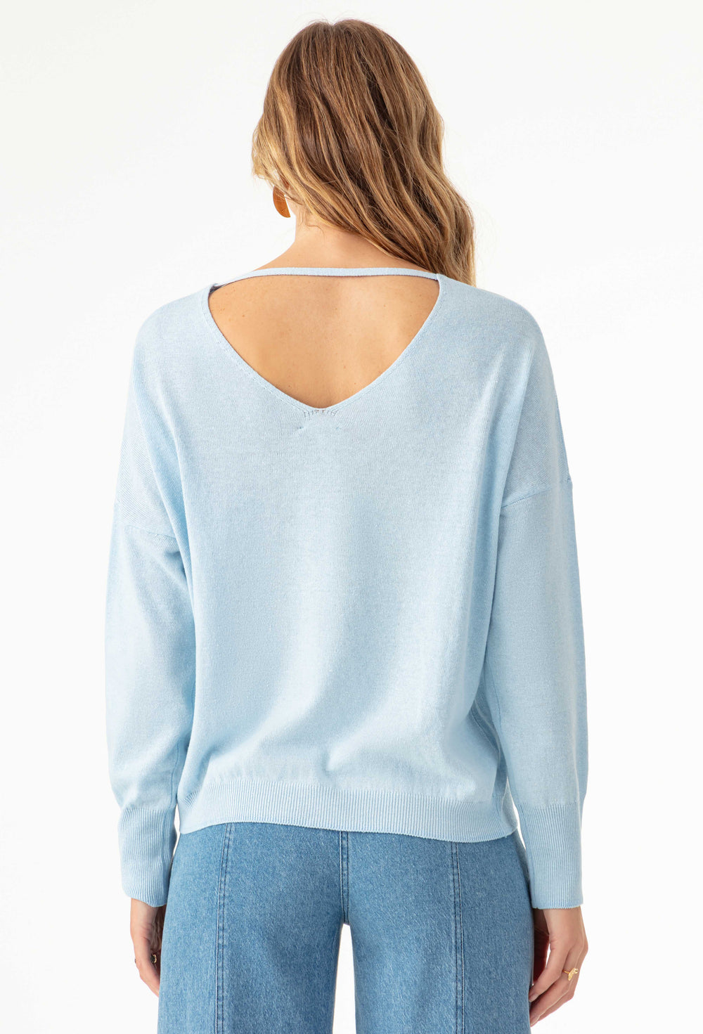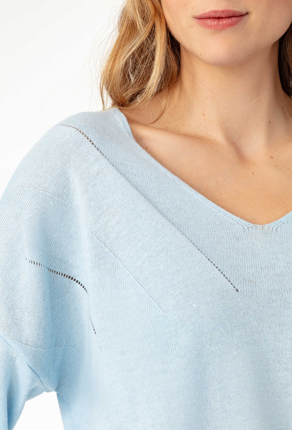 Le pull ZOE s'habille de baby blue dans une maille aérienne au charme discret. Idéal pour une silhouette confortable et lumineuse.