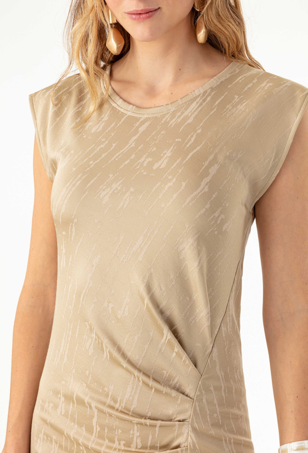 La mannequin mesure 1,75m et porte une taille 36.
