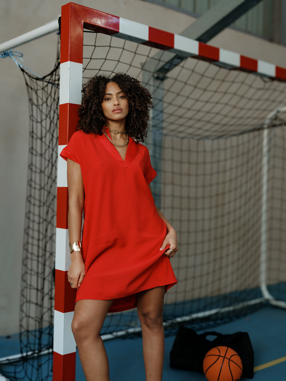 La mannequin mesure 1,73m et porte une taille 36.