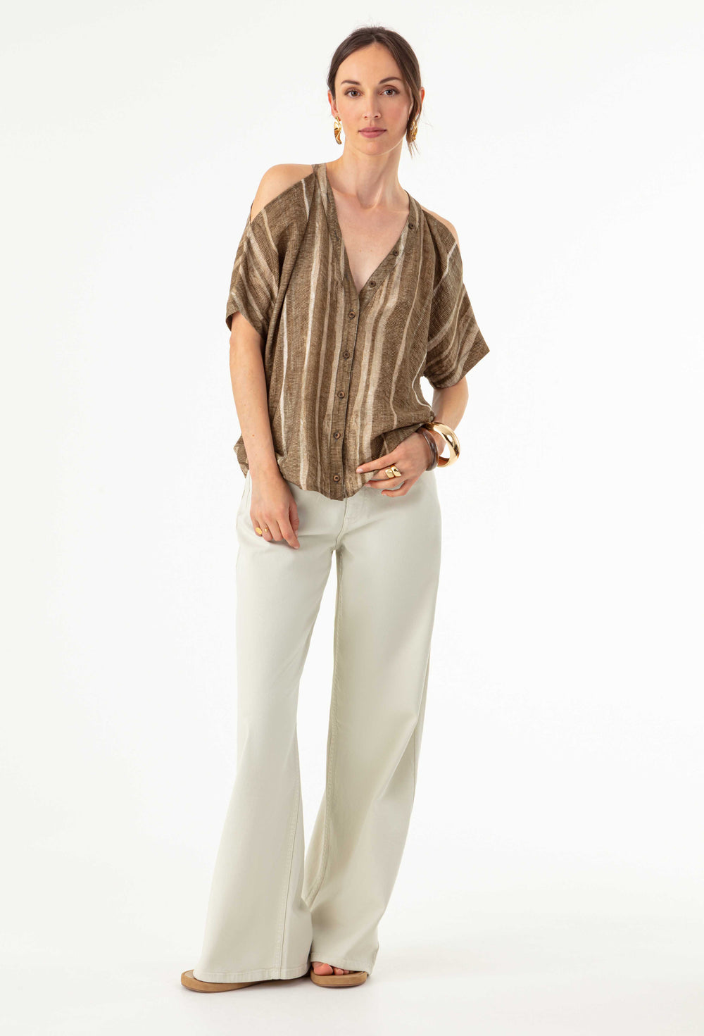 La mannequin mesure 1,73m et porte une taille 36.