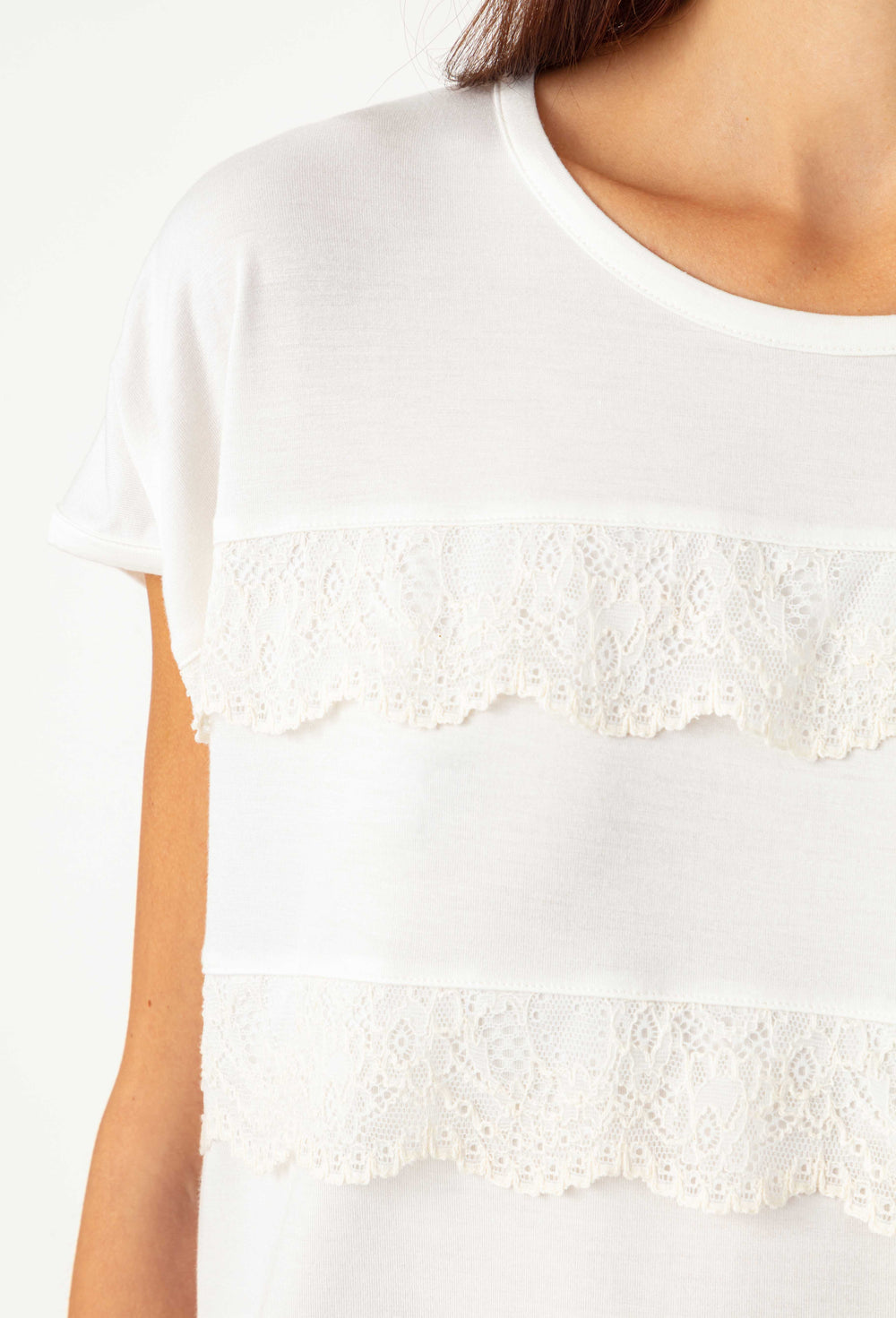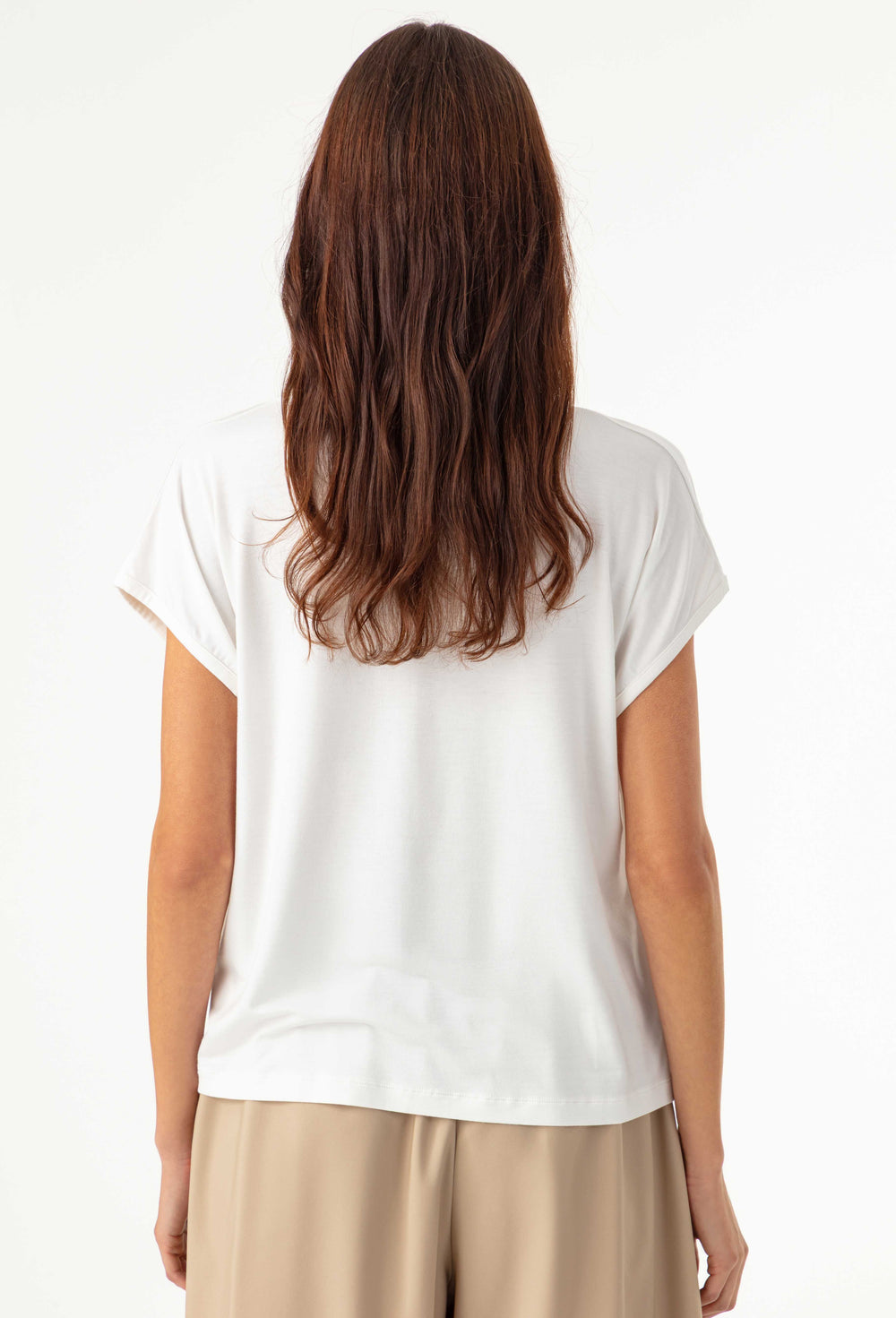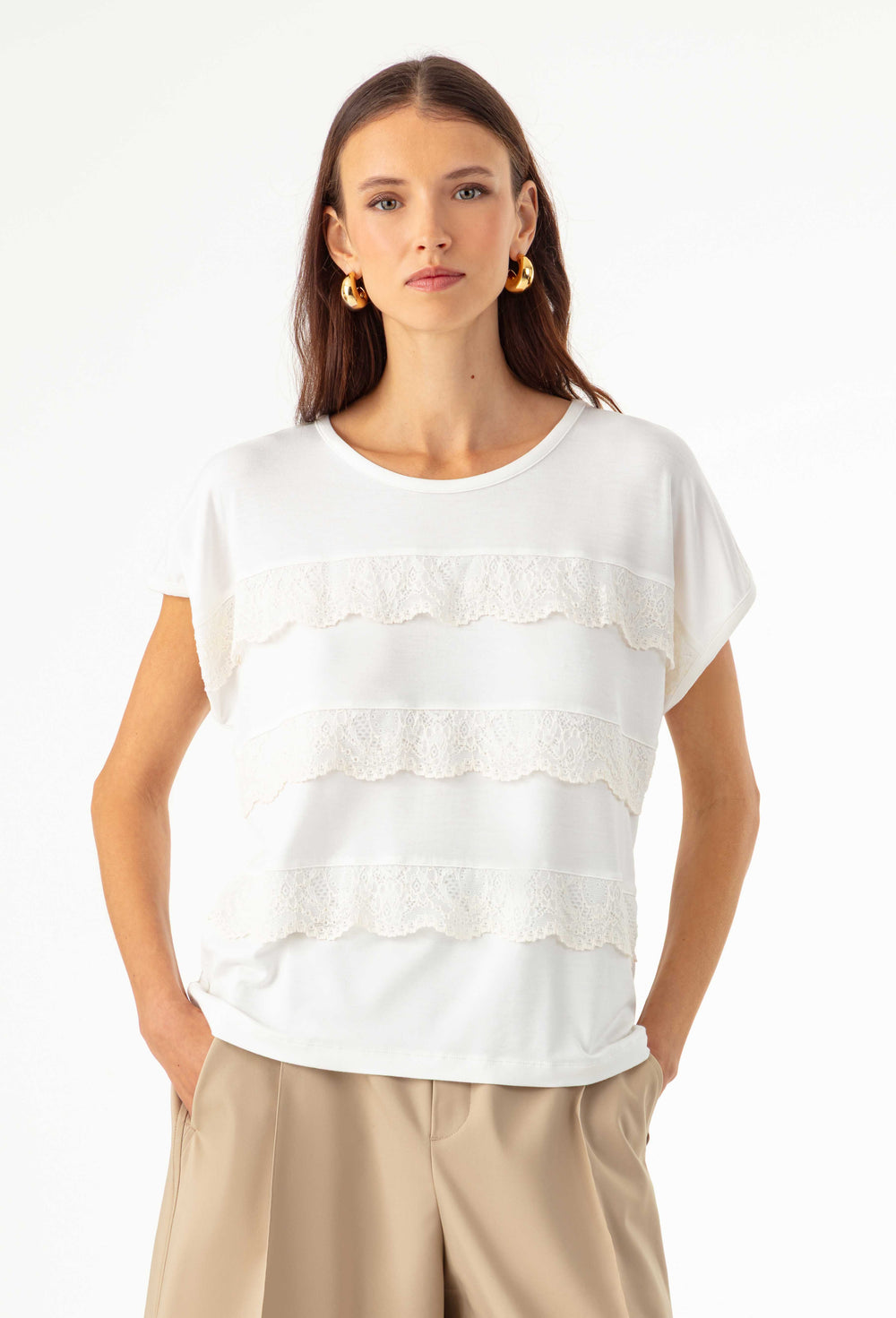 La mannequin mesure 1,71m et porte une taille 36.
