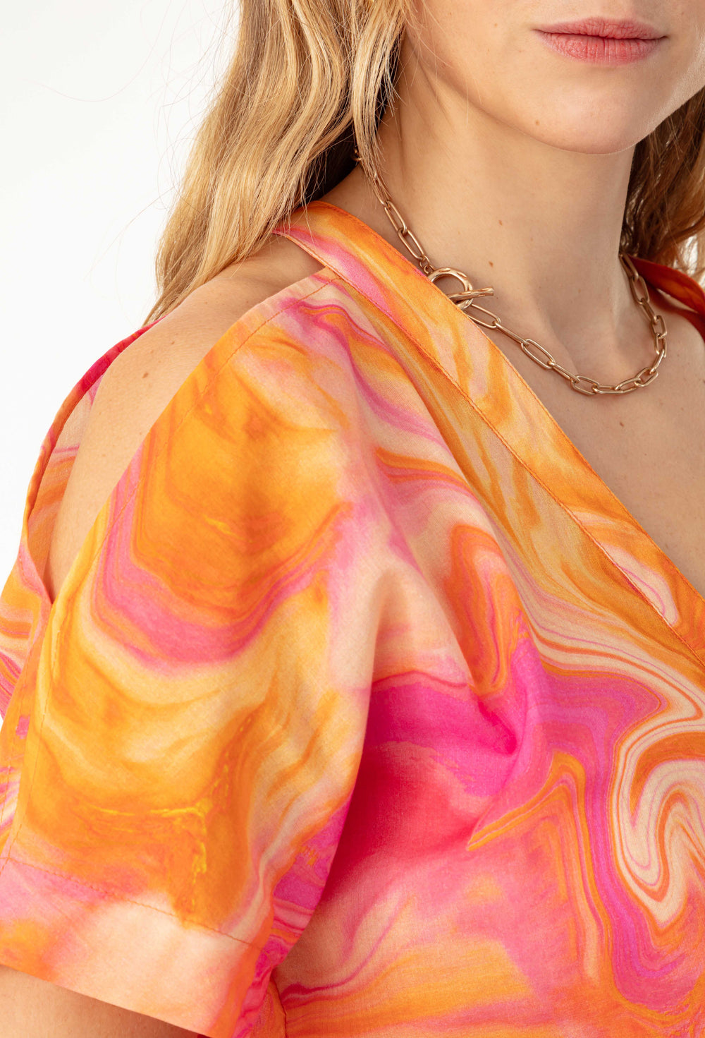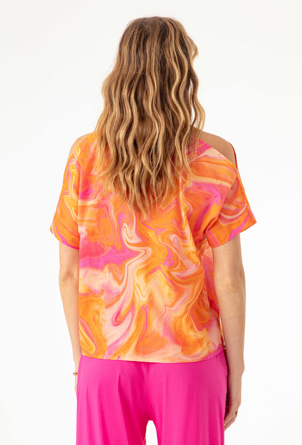 Le top Joann séduit par son voile de coton imprimé wavy et son encolure V esprit bardot. Ses découpes aux épaules et son boutonnage devant lui apportent une touche moderne et estivale.