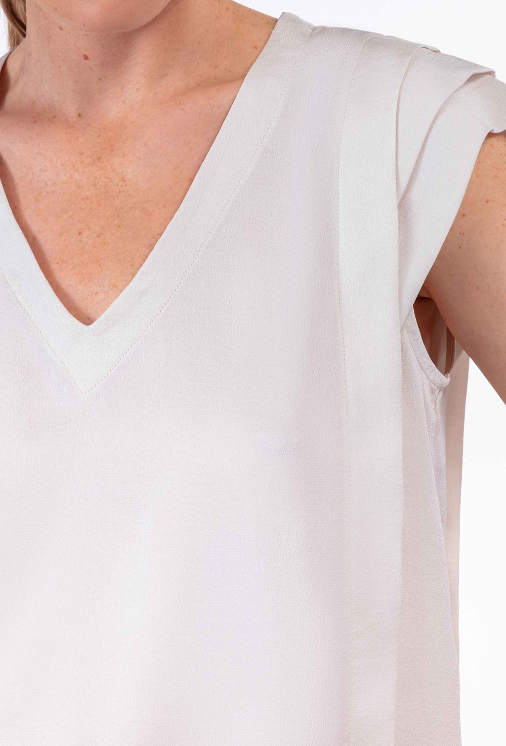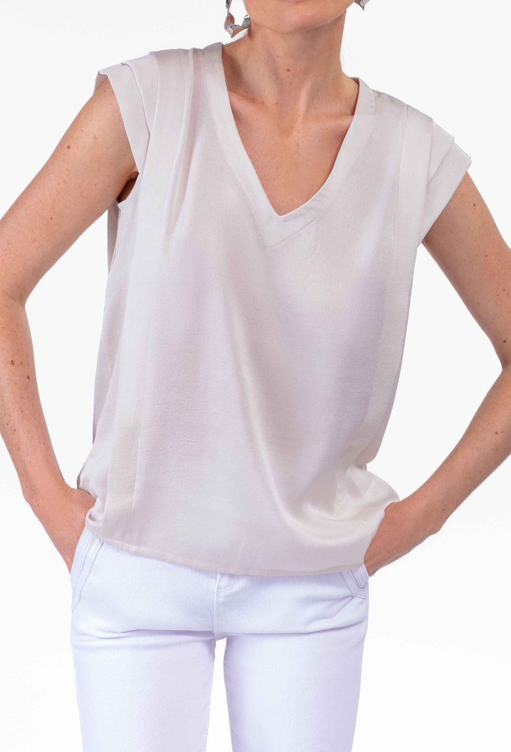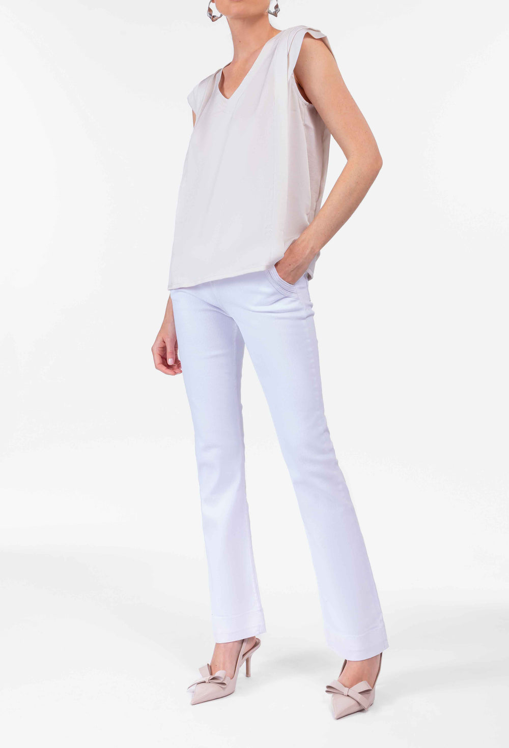 La mannequin mesure 1,77m et porte une taille 36.